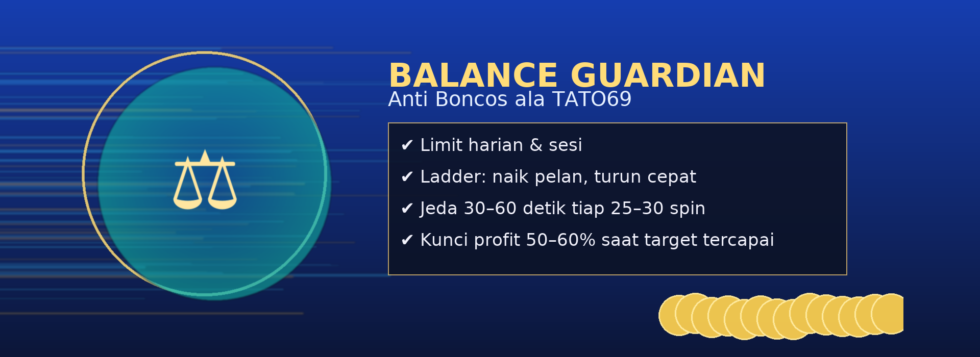 Balance Guardian bukan sekadar “irit,” melainkan strategi saldo tahan banting. Dengan tangga taruhan yang disiplin, stop rule ganda, dan telemetri sederhana, kamu menukar spekulasi liar dengan keputusan terukur. Hasilnya: sesi lebih tenang, profit lebih sering dibawa pulang, dan—yang terpenting—anti boncos.